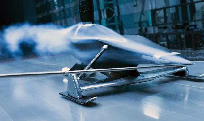 The sledge is attached to a strut that comes down from the ceiling. The strut contains hundreds of pressure sensors that gather data, as well as "actuators" that move the model during testing.